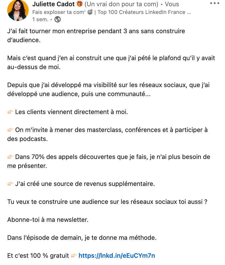 Personnellement, tous mes posts LinkedIn du mercredi, sans exception, sont dédiés à ma newsletter.